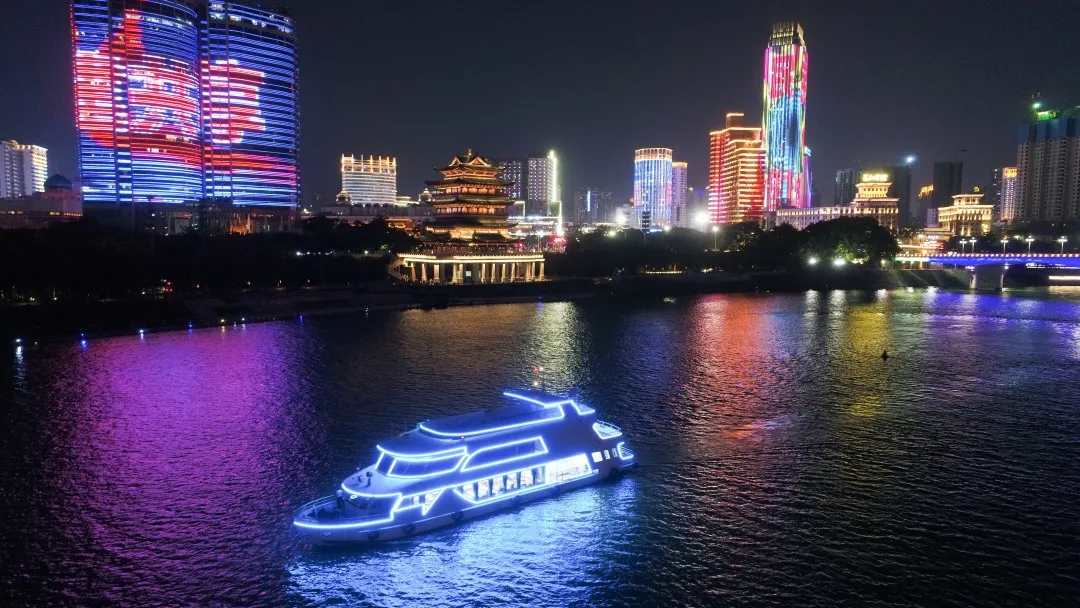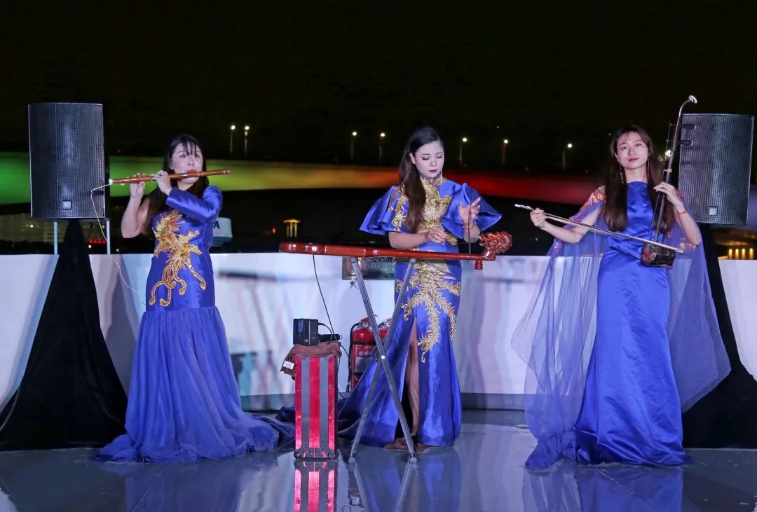 微風(fēng)拂面,夜景怡人,滿(mǎn)載游客的3艘邕江游船來(lái)回穿梭在邕江之上,沿江兩岸燈光絢麗多彩,跨江大橋恢弘大氣,民樂(lè)表演風(fēng)情十足,乘船游客紛紛拿出手機(jī)、相機(jī)合影留念。