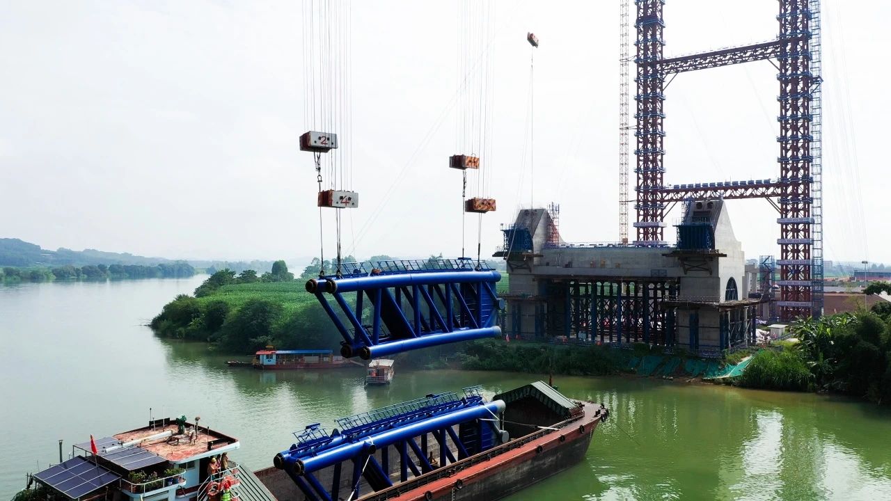 8月8日,南寧南過境線(吳圩機場至隆安延長線段)公路上正右江特大橋首節(jié)拱肋順利完成安裝,標志著這座項目關鍵控制性工程正式進入拱肋安裝的重要階段。